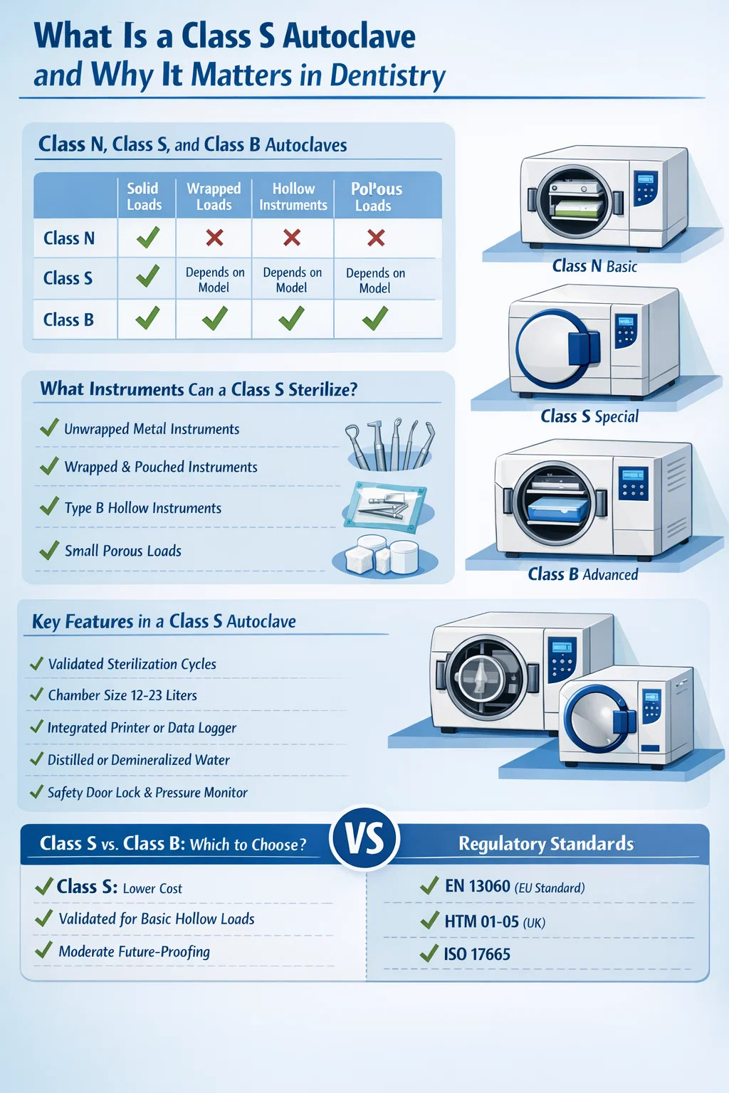 Autokláv triedy S je parný sterilizátor navrhnutý na manipuláciu so špecifickým, výrobcom definovaným rozsahom náplní – medzi základnou triedou N a plne schopnou triedou B, pokiaľ ide o sterilizačný výkon. V zubnej praxi, Autokláv triedy S je jednou z najčastejšie používaných sterilizačných jednotiek , pretože ponúka praktickú rovnováhu medzi cenou, rýchlosťou cyklu a schopnosťou spracovávať duté a porézne nástroje, ktoré sú štandardom v každej zubnej ambulancii.
