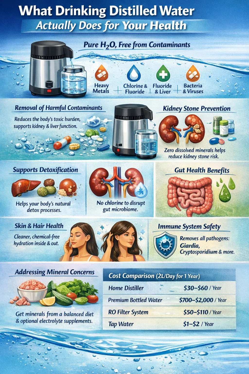 Zdravotné prínosy pitia destilovanej vody sú skutočné, ale sú to predovšetkým výhody neprítomnosti – neprítomnosti kontaminantov, patogénov, nežiaducich minerálov a chemických prísad. Toto nie je maličkosť. Vzhľadom na to, že bežný človek spotrebuje zhruba 700-1000 litrov vody ročne kumulatívny rozdiel medzi trvalo čistou vodou a kontaminovanou vodou počas životnosti je významný.