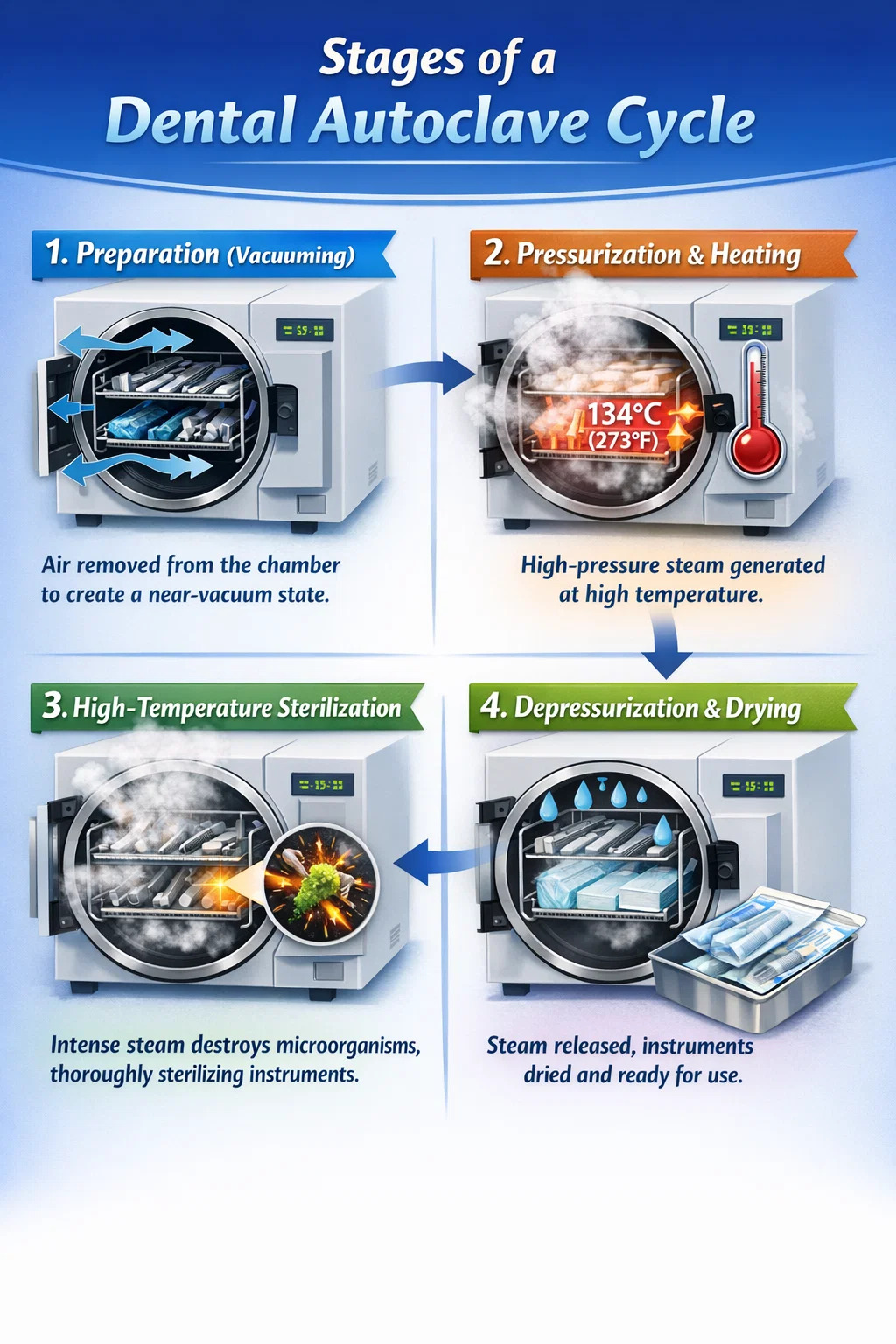 Zubné autoklávy, zjednodušene povedané, fungujú ako vylepšená verzia domáceho tlakového hrnca. Využívajú kombináciu vysokej teploty, vysokého tlaku a pary na dôkladné odstránenie mikroskopických nečistôt na chirurgických nástrojoch.