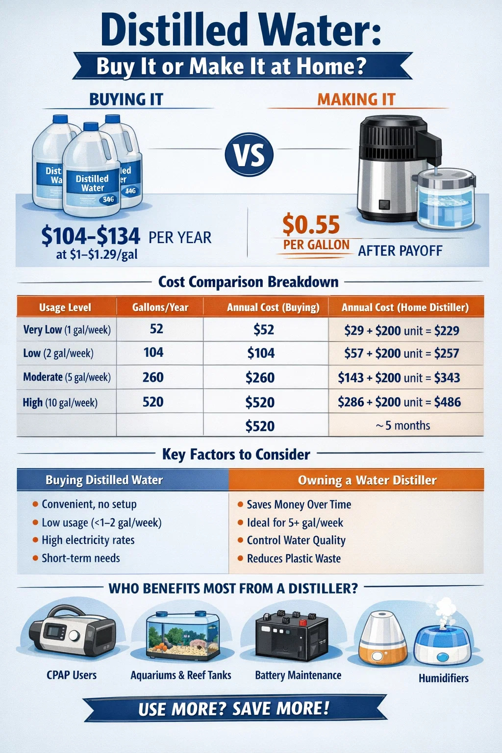 Použitie sa tiež rýchlo mení. Stroje CPAP spotrebujú v priemere asi 1 galón týždenne. Zvlhčovač, ktorý beží cez zimu, môže spotrebovať ďalších 1 až 2 galóny týždenne. Akvárium so slanou vodou, ktoré potrebuje pravidelné dopĺňanie, môže vyžadovať 3–5 galónov týždenne. Olovené batérie v solárnom zariadení alebo záložnej power banke potrebujú pravidelne destilovanú vodu. Poskladajte tieto použitia dohromady a 5 – 10 galónov za týždeň nie je nezvyčajné, čo tlačí ročné náklady na nákup v obchode na 260 – 520 $ ročne alebo viac.