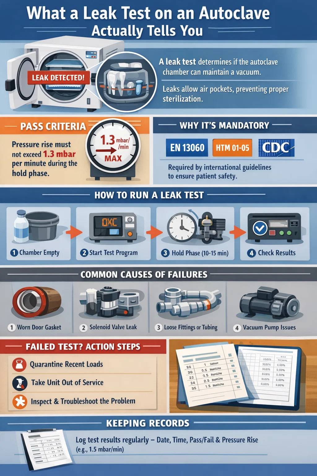 Okrem súladu existuje aj priamy mechanický dôvod. Cykly zubného autoklávu pred vákuom fungujú tak, že pred vstreknutím pary sa vytiahne séria vákuových impulzov na odstránenie vzduchu. Ak komora uniká, zvyškový vzduch vytvára izolačné vrecká okolo nástrojov. Teplota pary na povrchu prístroja sa môže na snímači zobraziť správne, ale skutočná kontaktná teplota v týchto vzduchových kapsách môže byť o 5 °C až 15 °C nižšia ako hodnota snímača komory , čo stačí na to, aby biologické ukazovatele zostali neohrozené a patogény boli životaschopné.