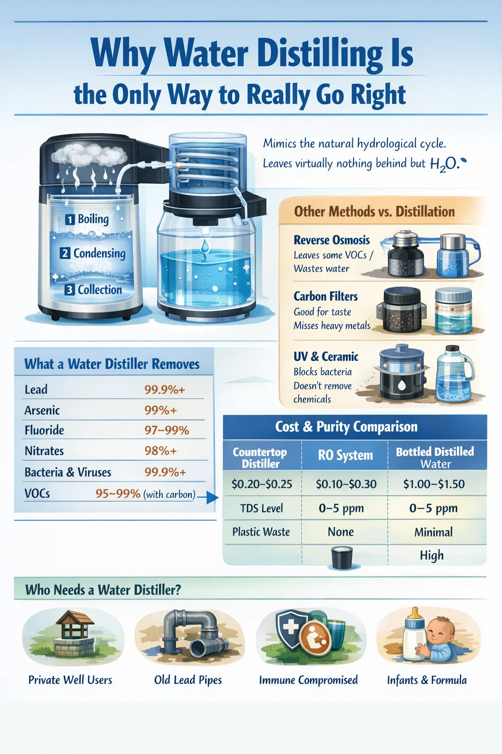 Ak ste strávili nejaký čas výskumom čistenia vody, pravdepodobne ste sa stretli s filtrami s reverznou osmózou, blokmi s aktívnym uhlím, UV sterilizátormi a keramickými filtrami. Všetky sľubujú čistú vodu. Niektoré z nich odvádzajú slušnú prácu pri odstraňovaní špecifických kontaminantov. Žiadny z nich sa však nepribližuje tomu, čo destilátor vody v skutočnosti robí. Keď ľudia hovoria, že destilácia vody je jediný spôsob, ako skutočne ísť správne, nie sú dramatickí. Opisujú fyzikálny proces, ktorý napodobňuje hydrologický cyklus a nezanecháva prakticky nič okrem molekúl H2O.