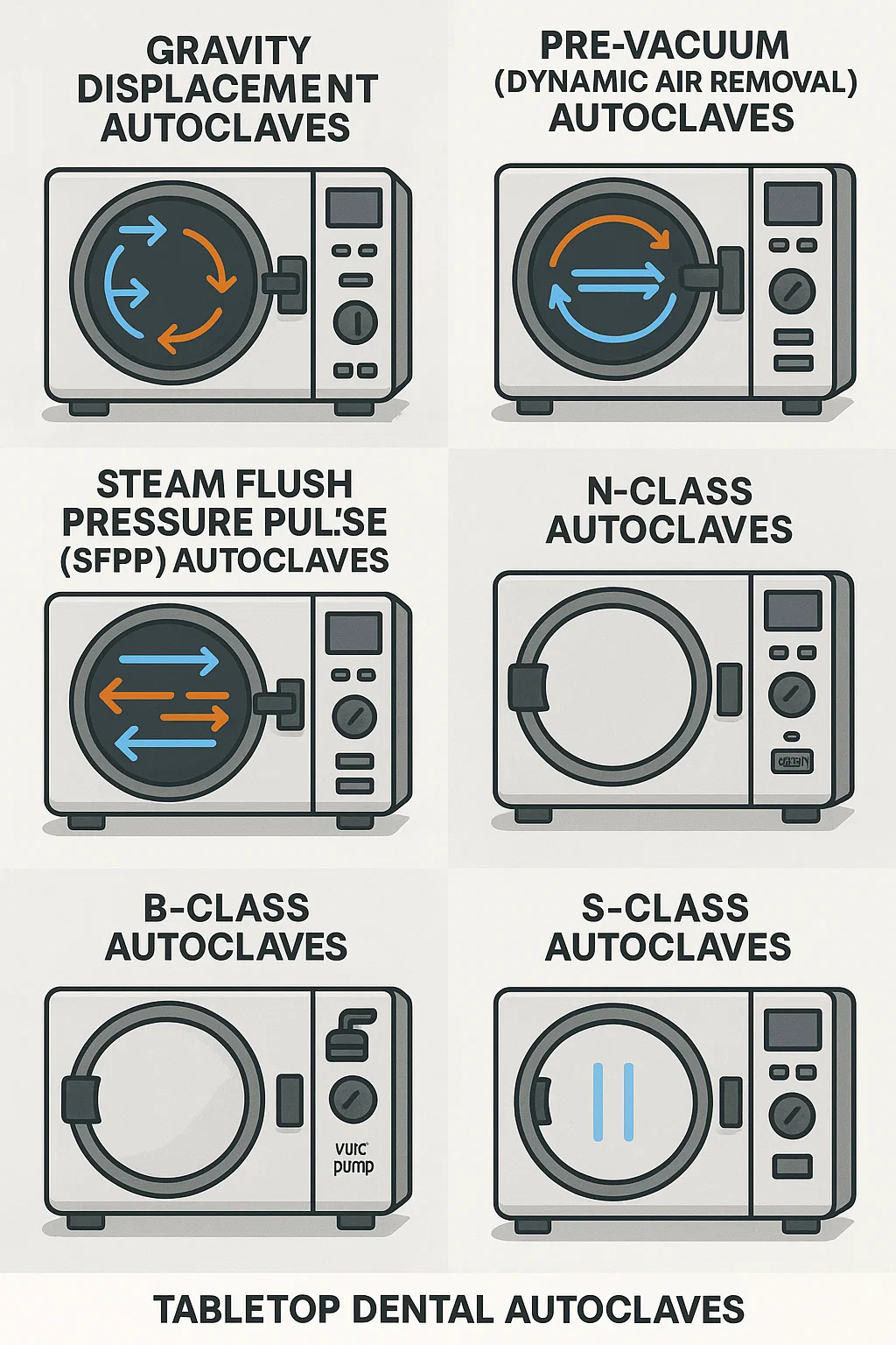 | Gravitačný posun | Para vytláča vzduch von cez gravitáciu | Pevné nástroje (kliešte, skalpely) | Malé kliniky so základnými nástrojmi |