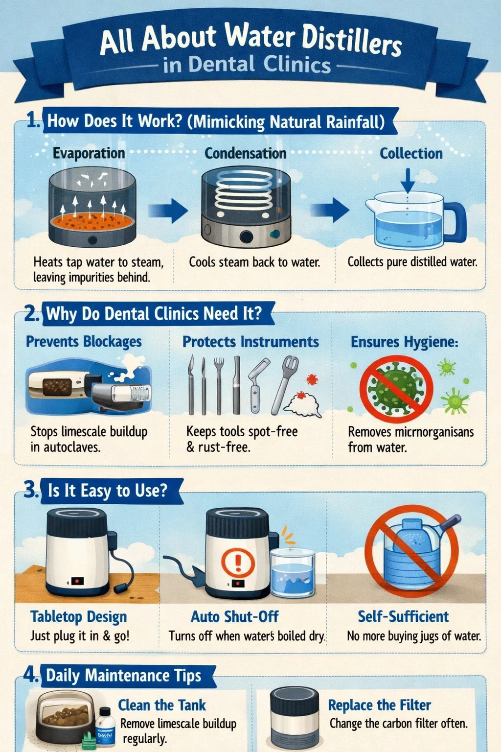 A destilátor vody je v podstate malá továreň, ktorá sa venuje výrobe „čistej vody“. V zubných ambulanciách je to zvyčajne najlepší partner pre zubné autoklávy, pretože autoklávy sú veľmi „vyberavé“ na vodu, ktorú používajú a môžu používať iba túto čistú destilovanú vodu.