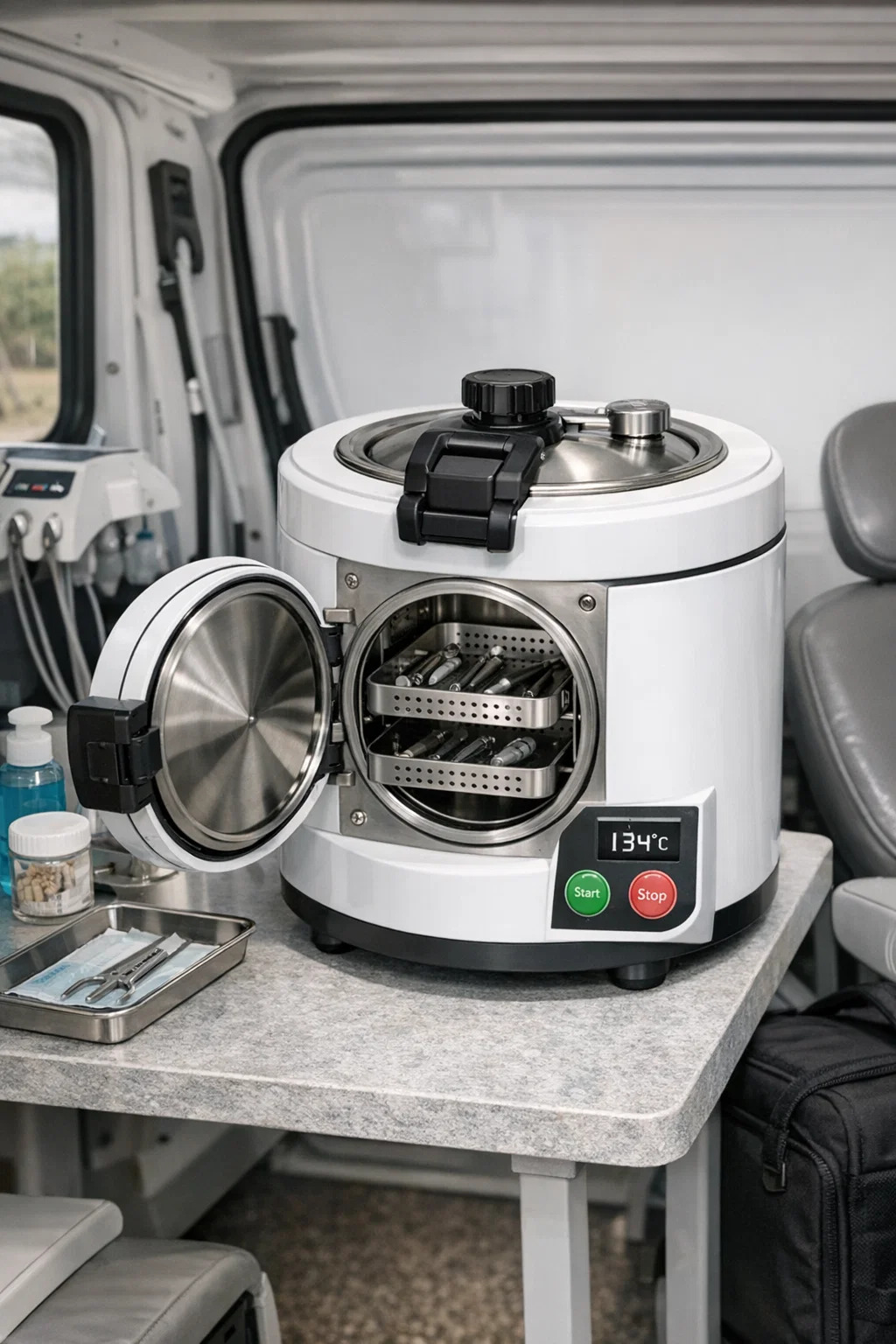 Flexibilita: Pre malé súkromné kliniky alebo prostredia s veľmi obmedzeným priestorom na ošetrenie, prenosný stomatologický autokláv dokonale rieši problém nedostatočného priestoru.
