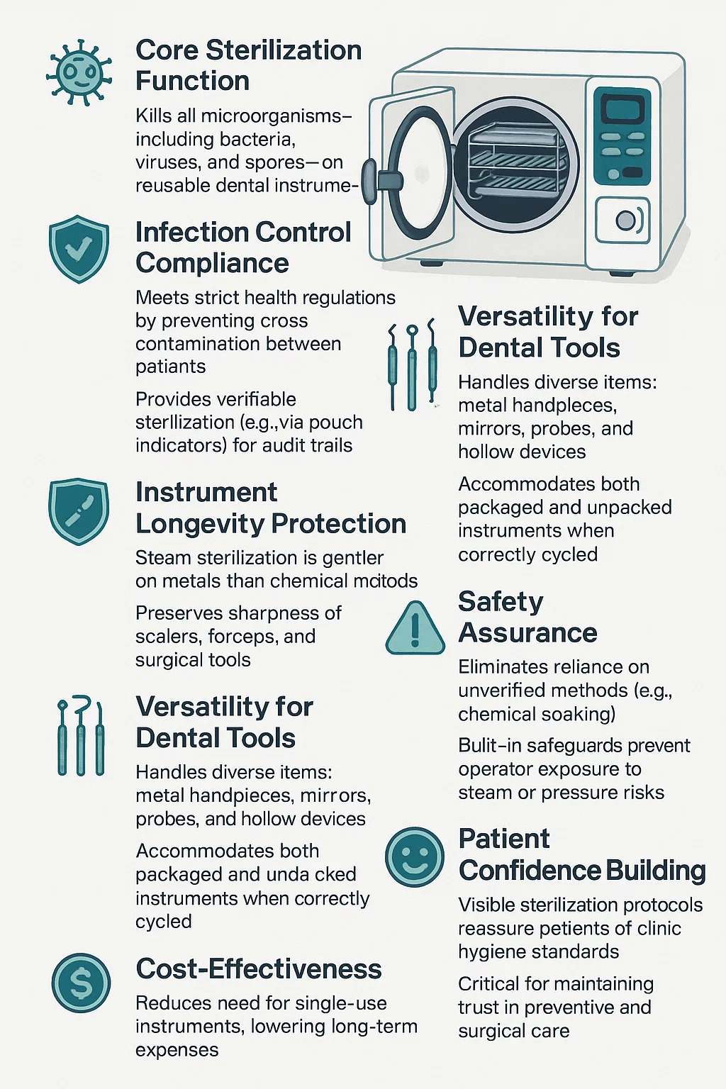 | Sterilizuje nástroje | Ničí všetky baktérie, vírusy a spóry | Zabezpečuje, že nástroje sú biologicky bezpečné na opätovné použitie |