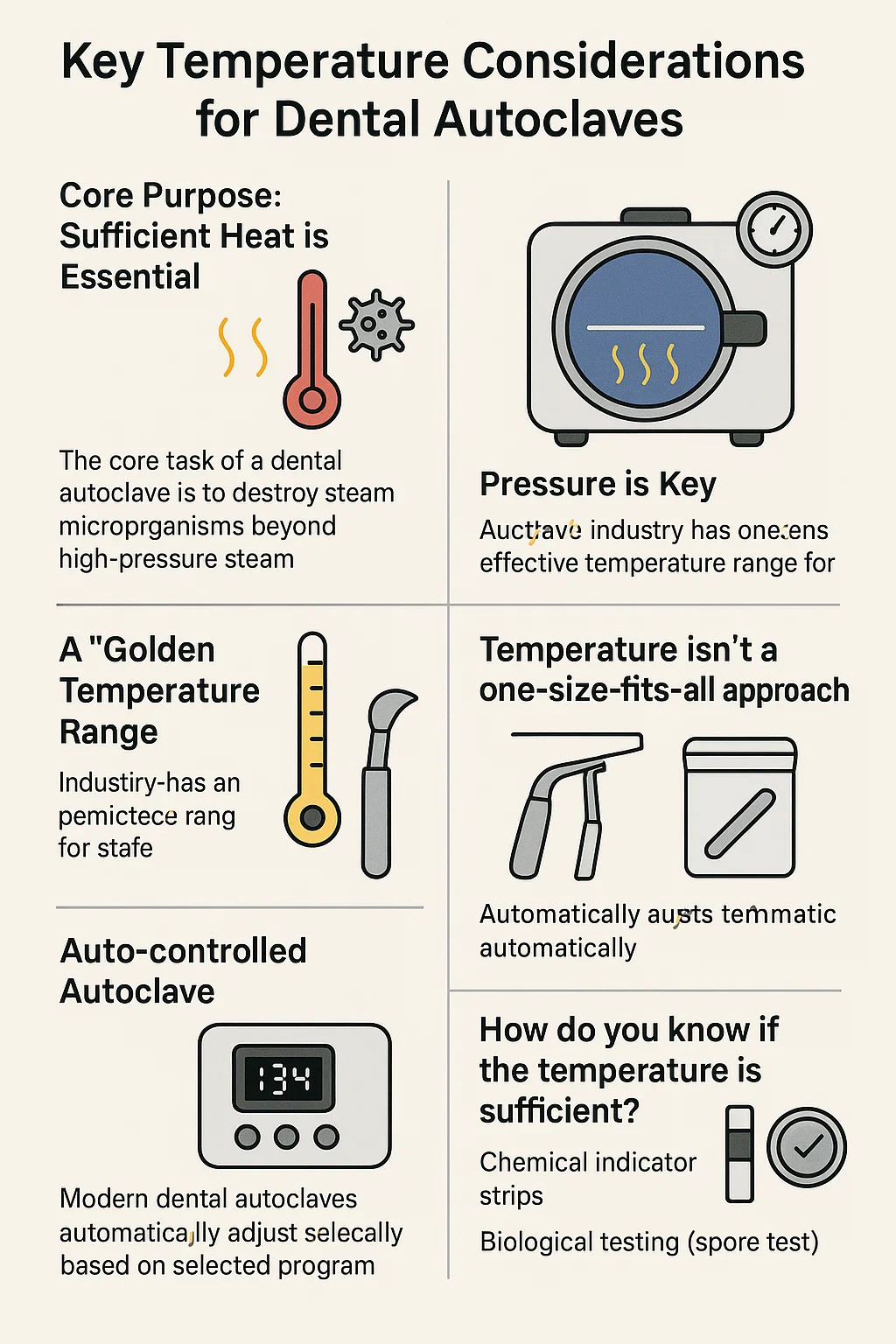Prostredníctvom dlhodobej praxe stomatologický priemysel identifikoval všeobecne akceptovaný a účinný teplotný rozsah pre sterilizáciu.